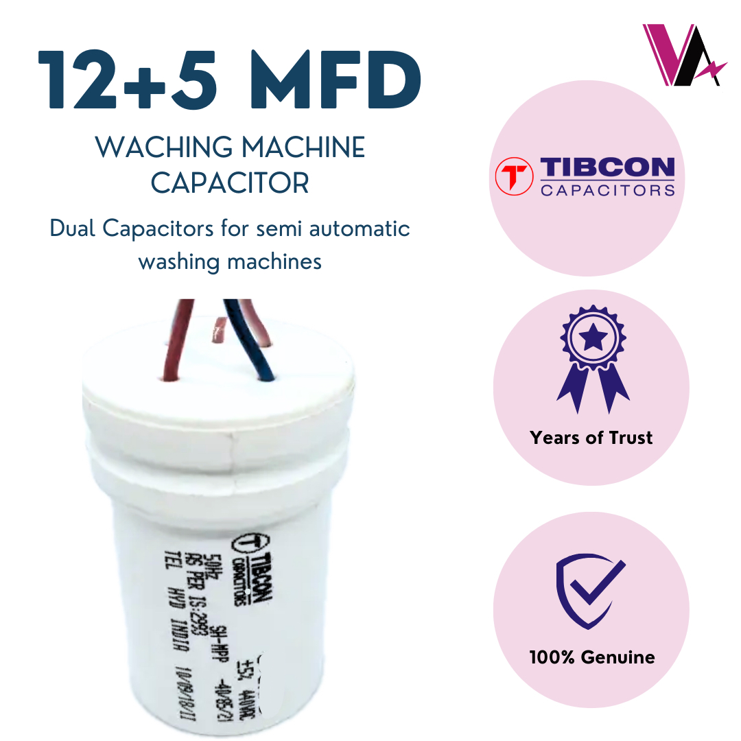 Upgrade your semi-automatic washing machine with the TIBCON 12+5 MFD Dual Capacitor and experience superior efficiency, reliability, and longevity. Trust in TIBCON's commitment to quality and innovation for all your capacitor needs.